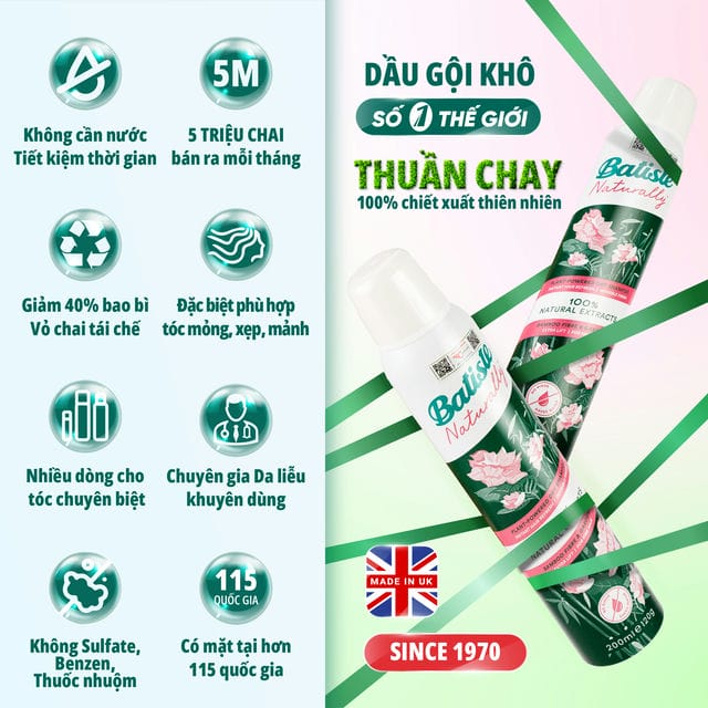 Trải nghiệm ngay Batiste Naturally 100% để cảm nhận sự khác biệt – vì một mái tóc sạch khỏe, vì một thế giới xanh.